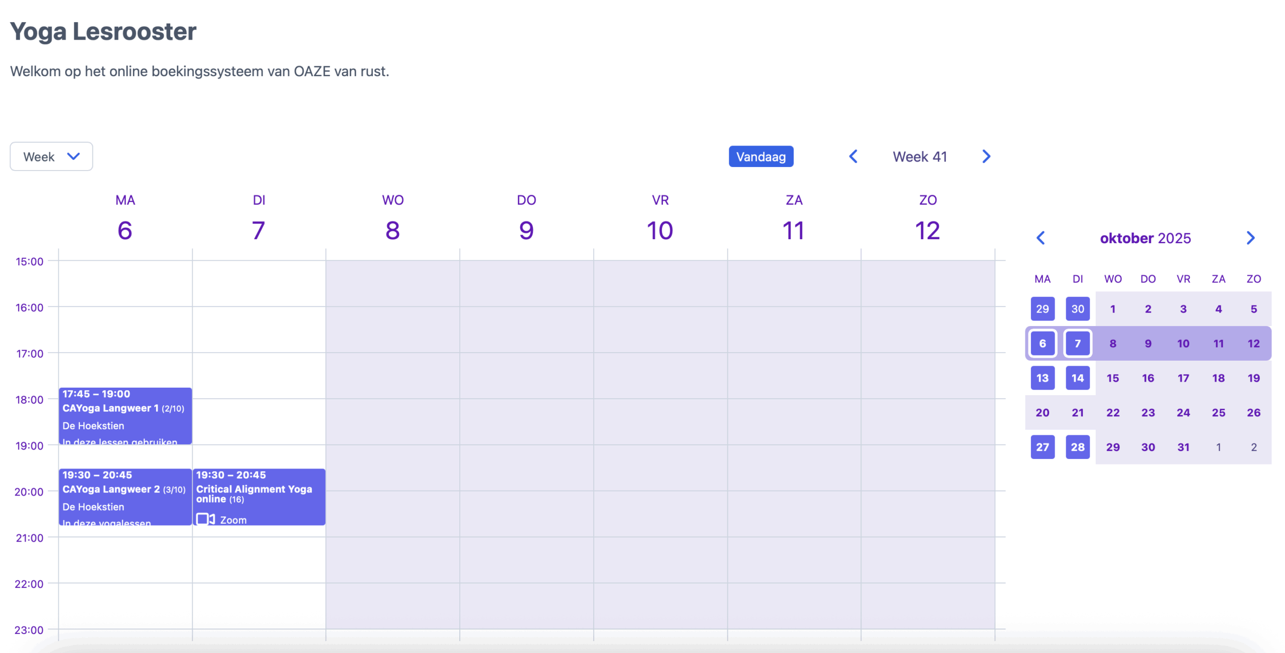 Voor iedere stap zie je het scherm dat je tegenkomt. Nadat je op de paarse knop “Boek jouw yogalessen” hebt geklikt, kom je standaard in een weekoverzicht, zoals hieronder te zien is.